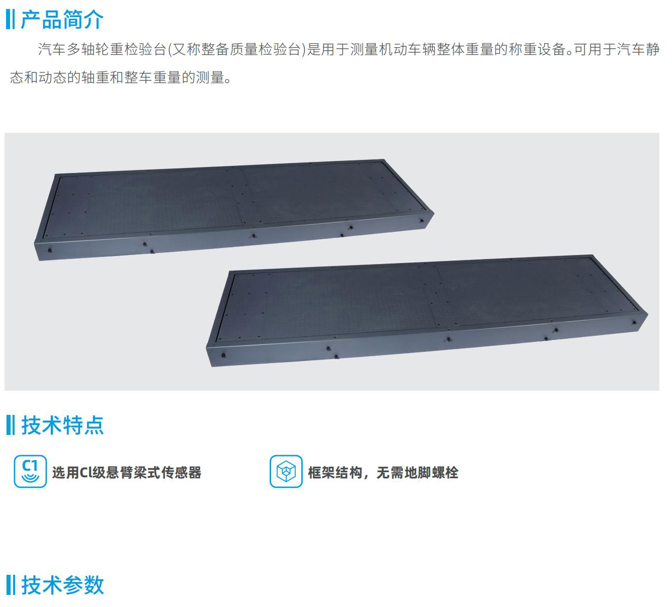汽車多軸輪重檢驗臺(又稱整備質量檢驗臺)是用于測量機動車輛整體重量的稱重設備??捎糜谄囲o態(tài)和動態(tài)的軸重和整車重量的測量。