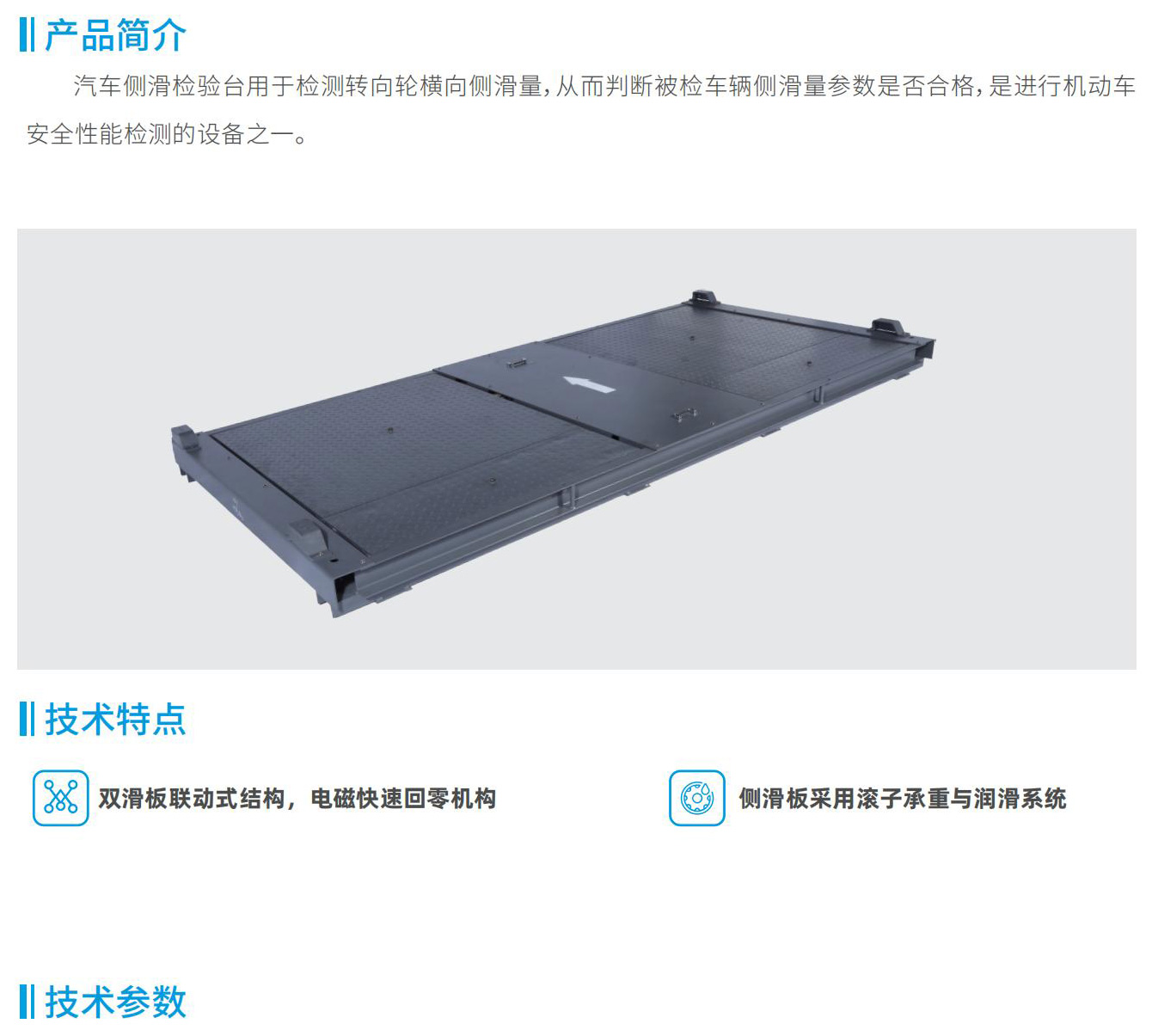 汽車側(cè)滑檢驗臺用于檢測轉(zhuǎn)向輪橫向側(cè)滑量,從而判斷被檢車輛側(cè)滑量參數(shù)是否合格,是進行機動車安全性能檢測的設(shè)備之一。